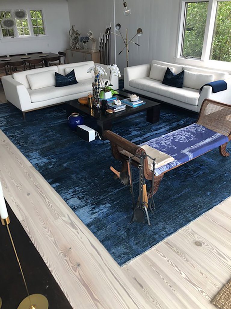 Glass doors and numerous windows flood this area with tons of natural light. Green shades from outside add color to the space, already showcasing white couches and a gorgeous blue area rug.